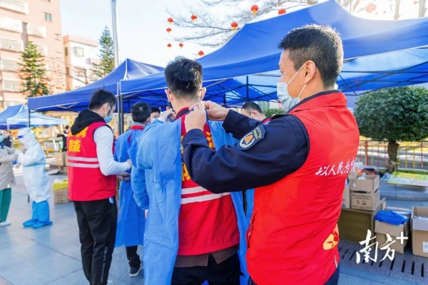 3月9日,濱海灣新區組織100名志愿者,由濱海灣新區黨工委委員楊永強和疫情防控指揮辦相關負責人帶隊,濱海灣正中科學園項目及相關企事業單位志愿者共同前往虎門鎮協助大規模核酸檢測的采樣工作。