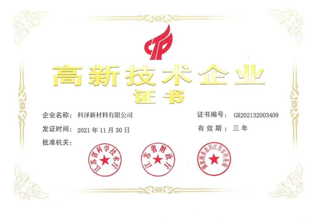 近日,由全國高新技術企業(yè)認定管理工作領導小組辦公室正式對外發(fā)布《關于公示江蘇省2021年第二批認定報備高新技術企業(yè)名單的通知》,“科澤新材料有限公司”榮獲“國家級高新技術企業(yè)”認證,該項成果的取得,不僅是科澤新材堅持以科技為先導,以創(chuàng)新為動力所取得的重大發(fā)展成果,也代表著科澤新材雄厚的自主創(chuàng)新研發(fā)實力。